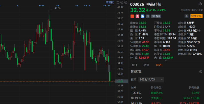 A股异动丨股东拟减持,中晶科技跌6.24%,创阶段新低