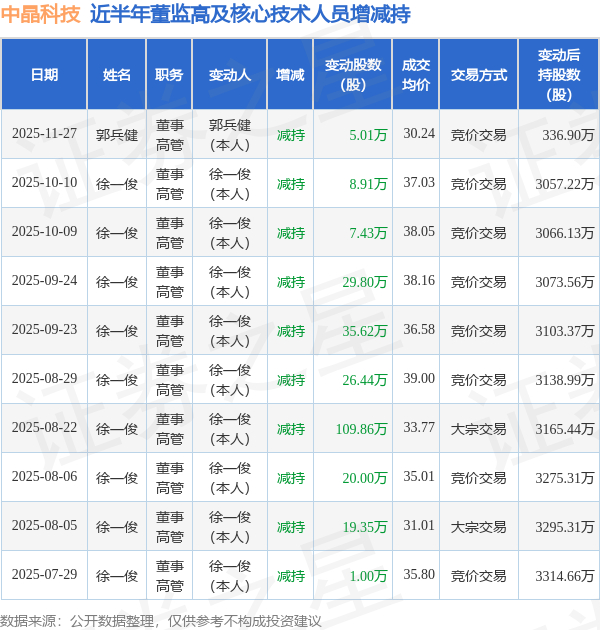 中晶科技近半年内的董监高及核心技术人员增减持详情如下: