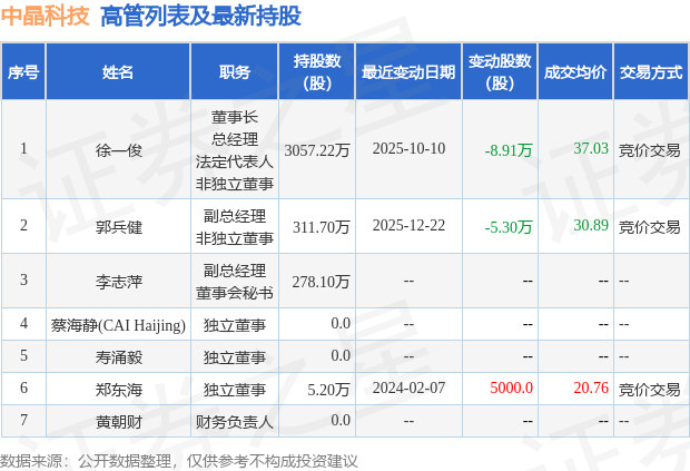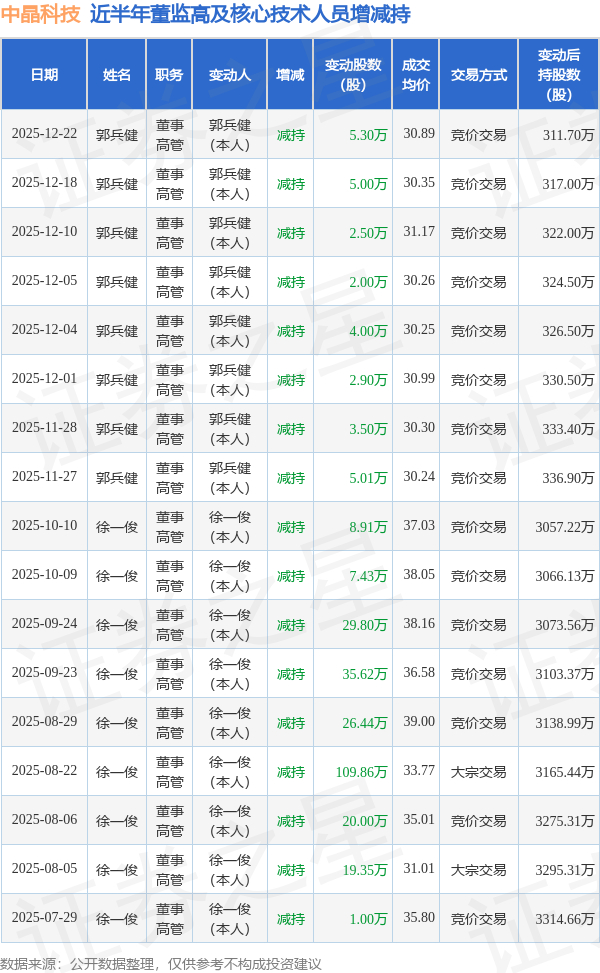 中晶科技近半年内的董监高及核心技术人员增减持详情如下: