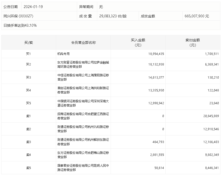 1月19日,同兴环保今日涨停,龙虎榜数据显示,上榜营业部席位全天成交1.54亿元,占当日总成交金额比例为23.15%。其中,买入金额为8144.06万元,卖出金额为7253.35万元,合计净买入890.71万元。