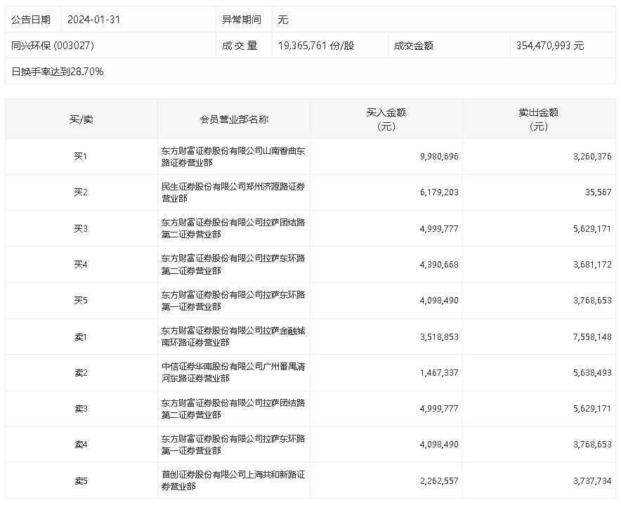 1月31日,同兴环保今日跌停,全天换手率达29.05%,振幅达9.51%。龙虎榜数据显示,营业部席位合计净买入358.83万元。其中,东方财富证券拉萨金融城南环路证券营业部、中信证券华南广州番禺清河东路证券营业部分别卖出755.81万元、563.85万元;东方财富证券山南香曲东路证券营业部、民生证券郑州济源路证券营业部分别买入998.07万元、617.92万元。
