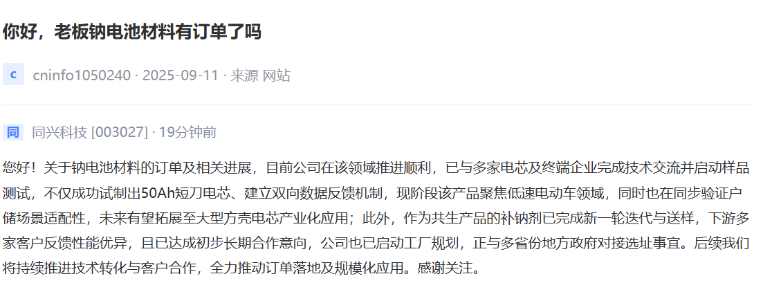 上证报中国证券网讯 同兴科技16日在互动平台上回复投资者提问时表示,目前公司在钠电池材料领域推进顺利,已与多家电芯及终端企业完成技术交流并启动样品测试,不仅成功试制出50Ah短刀电芯、建立双向数据反馈机制,现阶段该产品聚焦低速电动车领域,同时也在同步验证户储场景适配性,未来有望拓展至大型方壳电芯产业化应用;此外,作为共生产品的补钠剂已完成新一轮迭代与送样,下游多家客户反馈性能优异,且已达成初步长期合作意向,公司也已启动工厂规划,正与多省份地方政府对接选址事宜。