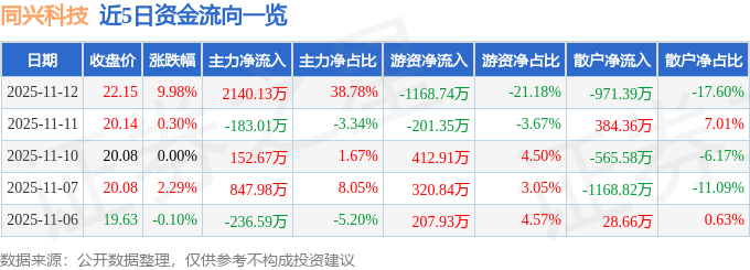 11月12日的资金流向数据方面,主力资金净流入2140.13万元,占总成交额38.78%,游资资金净流出1168.74万元,占总成交额21.18%,散户资金净流出971.39万元,占总成交额17.6%。