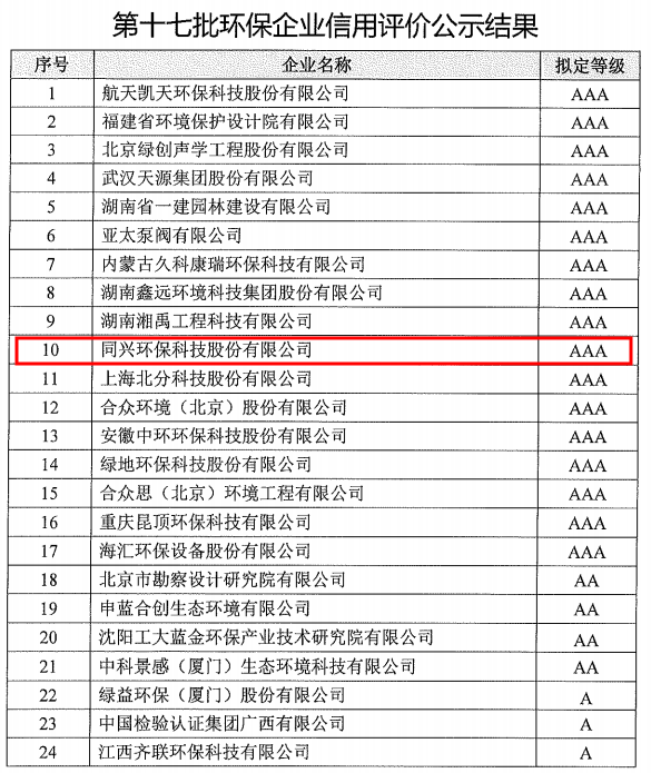近日,中国环境保护产业协会正式发布第十七批环保企业信用评价结果。同兴科技成功获评AAA级信用企业,跻身国家级环保信用优质企业行列,标志着公司在诚信建设、合规经营及行业贡献等方面获得国家层面权威认可。