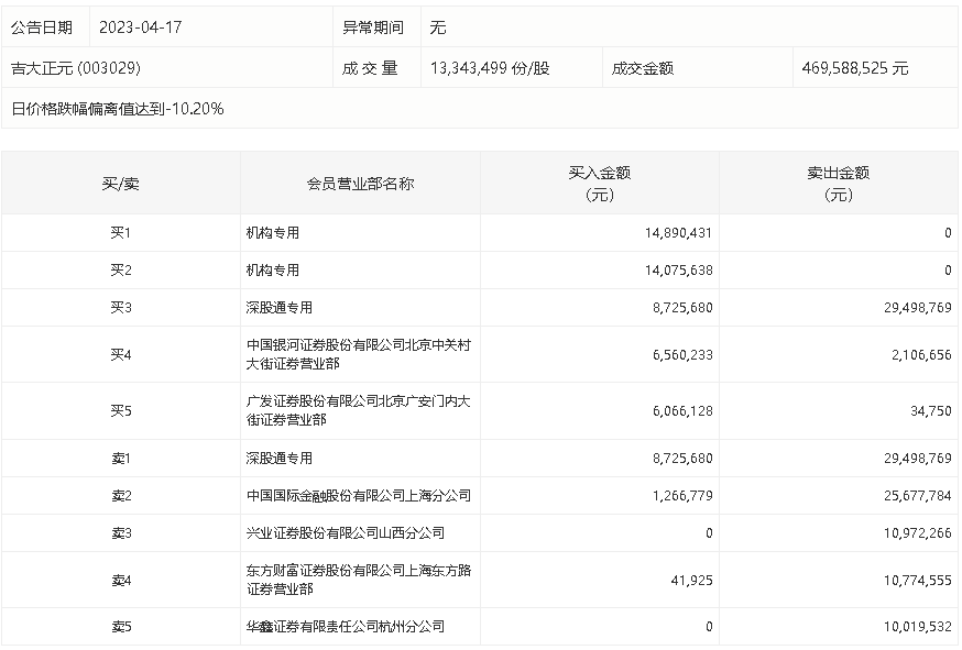 4月17日,吉大正元今日跌停,龙虎榜数据显示,上榜营业部席位全天成交1.41亿元,占当日总成交金额比例为29.96%。其中,买入金额为5162.68万元,卖出金额为8908.43万元,合计净卖出3745.75万元。