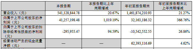 其中,2025年第三季度,公司实现营业收入5.41亿元,同比增长20.67%;归属于上市公司股东的净利润为4,125.72万元,同比增长1,019.19%;归属于上市公司股东的扣除非经常性损益的净利润为-29.60万元,上年同期为-547.36万元。