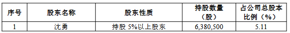 截至公告披露日,沈勇持有祖名股份6,380,500股,占公司总股本的比例为5.11%。