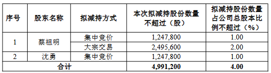 蔡祖明与沈勇合计拟减持股份不超过4,991,200股,占公司总股本比例不超过4.00%。