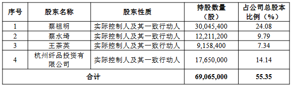 截至公告披露日,蔡祖明持有祖名股份30,045,400股,占公司总股本的比例为24.08%。蔡祖明及其一致行动人蔡水埼、王茶英、杭州纤品投资有限公司合计持有公司股份69,065,000股,占公司总股本的比例为55.35%。
