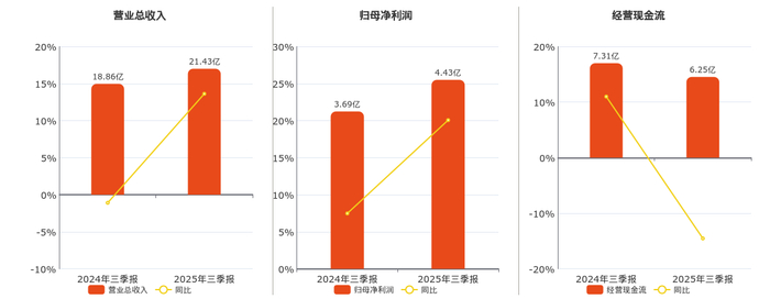 公司营业总收入为21.43亿元,在已披露的同业公司中排名第16,较去年同报告期营业总收入增加2.57亿元,同比较去年同期上涨13.62%。归母净利润为4.43亿元,在已披露的同业公司中排名第9,较去年同报告期归母净利润增加7409.84万元,实现2年连续上涨,同比较去年同期上涨20.07%。经营活动现金净流入为6.25亿元,在已披露的同业公司中排名第4。