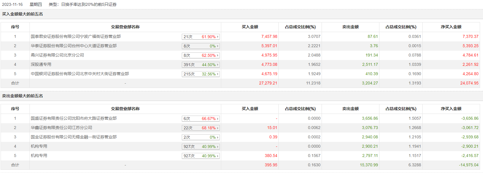 具体来看,机构买入380.54万元,卖出5697.32万元,合计净卖出5316.78万元。此外,知名游资现身龙虎榜,国泰君安证券宁波广福街证券营业部、方新侠(华泰证券台州中心大道证券营业部)分别买入7457.98万元、5397.01万元;国盛证券沈阳市府大路证券营业部、华鑫证券江苏分公司分别卖出3656.86万元、3076.73万元。