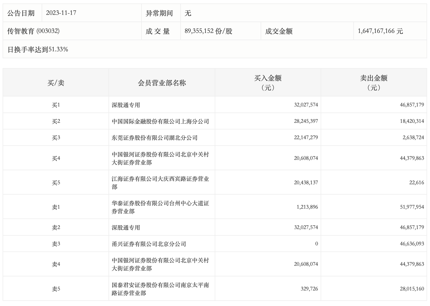 11月17日,传智教育今日跌5.71%,龙虎榜数据显示,上榜营业部席位全天成交3.64亿元,占当日总成交金额比例为22.1%。其中,买入金额为1.25亿元,卖出金额为2.39亿元,合计净卖出1.14亿元。