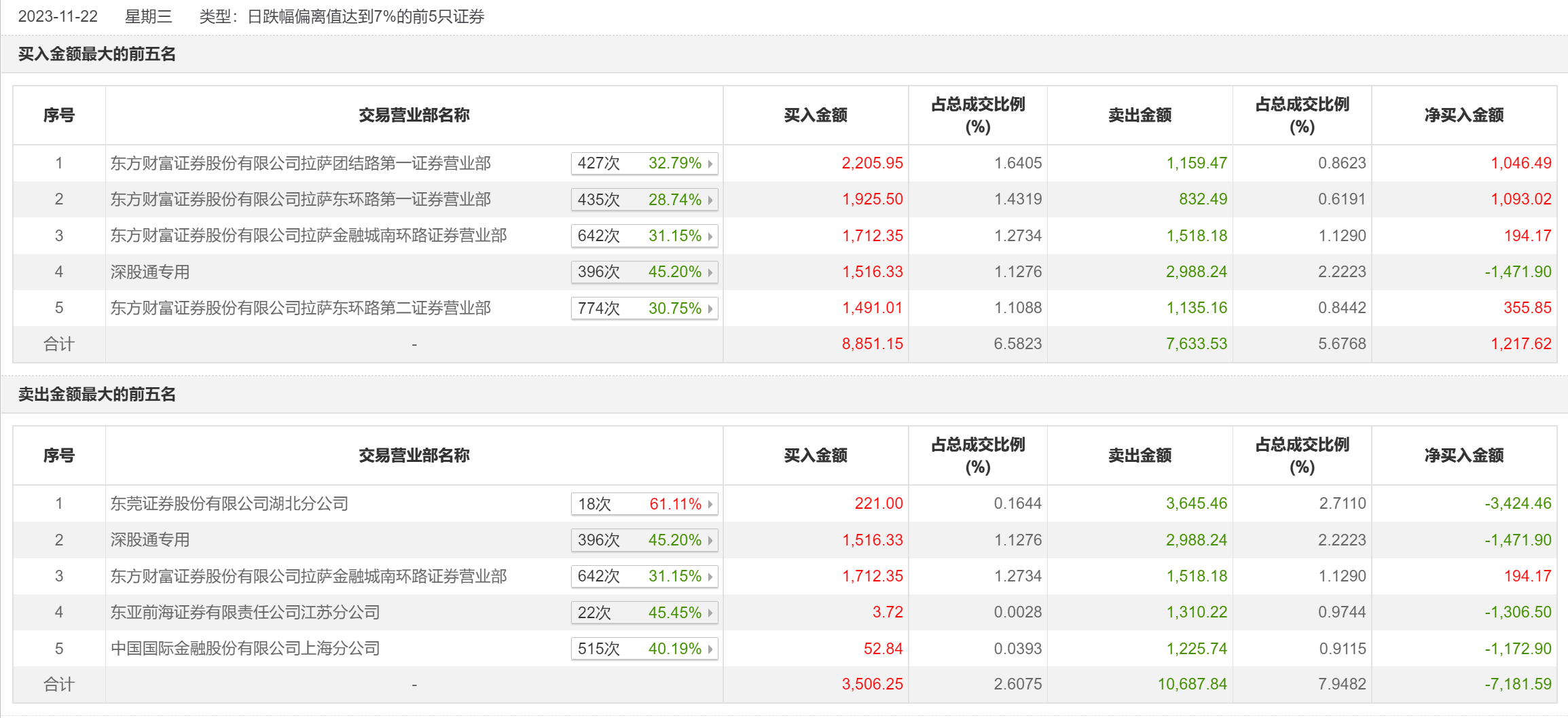 11月22日,传智教育今日跌停,全天换手率达41.09%,振幅达4.87%。龙虎榜数据显示,营业部席位合计净卖出4686.24万元。其中,东莞证券湖北分公司、深股通专用分别卖出3645.46万元、2988.24万元;东方财富证券拉萨团结路第一证券营业部、东方财富证券拉萨东环路第一证券营业部分别买入2205.95万元、1925.50万元。