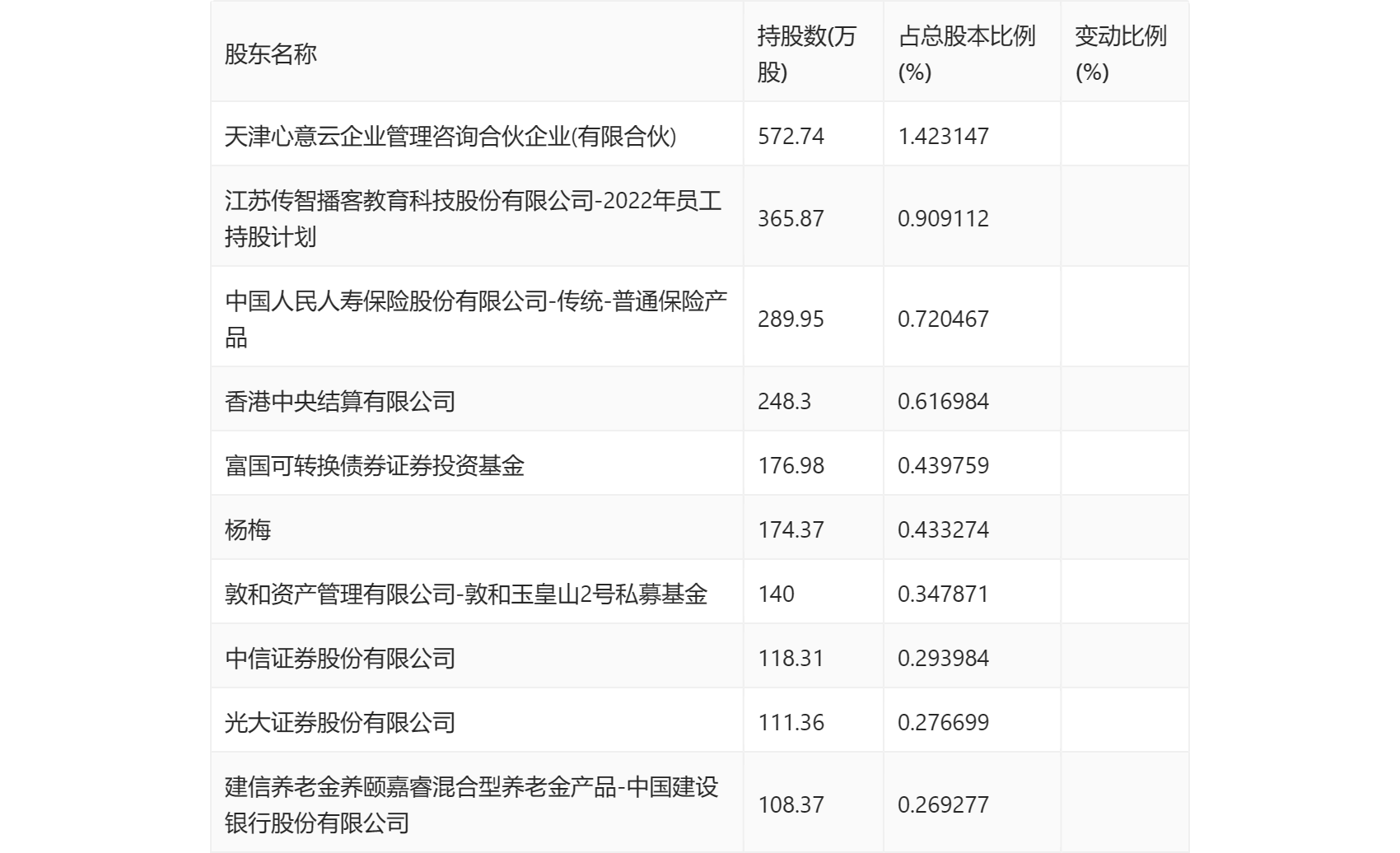 年报显示,2023年年末公司十大流通股东中,新进股东为香港中央结算有限公司、富国可转换债券证券投资基金、敦和资产管理有限公司-敦和玉皇山2号私募基金、中信证券股份有限公司、光大证券股份有限公司、建信养老金养颐嘉睿混合型养老金产品-中国建设银行股份有限公司,取代了三季度末的香港上海汇丰银行有限公司、蓝图创新投资管理(北京)有限公司-厦门蓝图天兴投资合伙企业(有限合伙)、华泰证券股份有限公司、曲晓燕、张欣航、安徽君合达鼎投资管理有限公司-合肥北城壹号创业投资合伙企业(有限合伙)。在具体持股比例上,天津心意云企业管理咨询合伙企业(有限合伙)、杨梅持股有所下降。