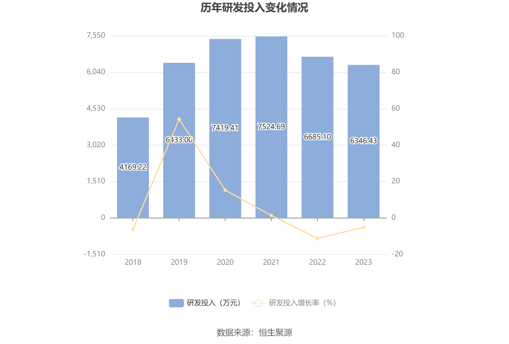 2023年全年,公司研发投入金额为6346.43万元,同比下降5.07%;研发投入占营业收入比例为11.87%,相比上年同期上升3.54个百分点。此外,公司全年研发投入资本化率为0。