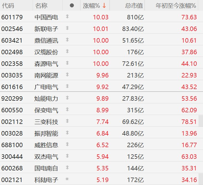 格隆汇1月20日|A股市场智能电网股集体走强,其中,中国西电、新联电子、鼎信通讯、汉缆股份、森源电气、南网能源、广电电气涨停,灿能电力涨超9%,保变电气涨超8%,三变科技涨超7%,振邦智能、威胜信息涨超6%,双杰电气、国电南自、科陆电子涨曹5%。