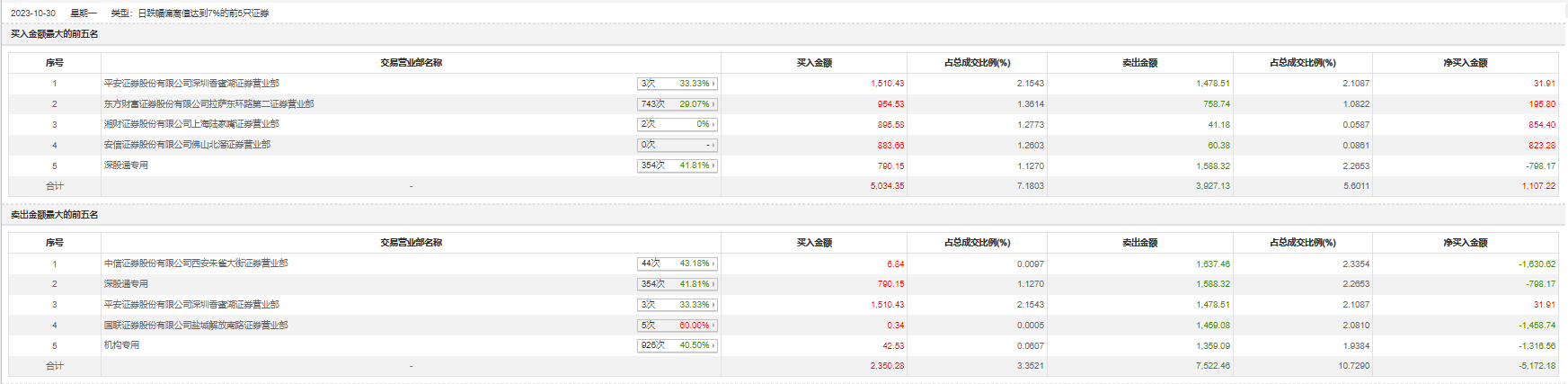 10月30日,顺控发展今日跌停,全天换手率达33.26%,振幅达3.53%。龙虎榜数据显示,营业部席位合计净卖出3298.71万元。其中,机构买入42.53万元,卖出1359.09万元,合计净卖出1316.56万元。此外,方新侠(中信证券西安朱雀大街证券营业部)、深股通专用分别卖出1637.46万元、1588.32万元;平安证券深圳香蜜湖证券营业部、东方财富证券拉萨东环路第二证券营业部分别买入1510.43万元、954.53万元。