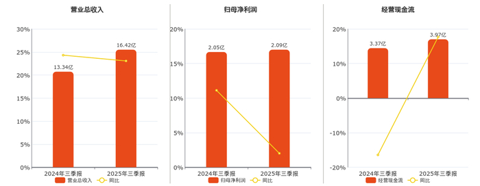 公司营业总收入为16.42亿元,较去年同报告期营业总收入增加3.08亿元,实现5年连续上涨,同比较去年同期上涨23.06%。归母净利润为2.09亿元,较去年同报告期归母净利润增加410.42万元,实现3年连续上涨,同比较去年同期上涨2.01%。经营活动现金净流入为3.97亿元,较去年同报告期经营活动现金净流入增加5956.52万元,同比较去年同期上涨17.67%。