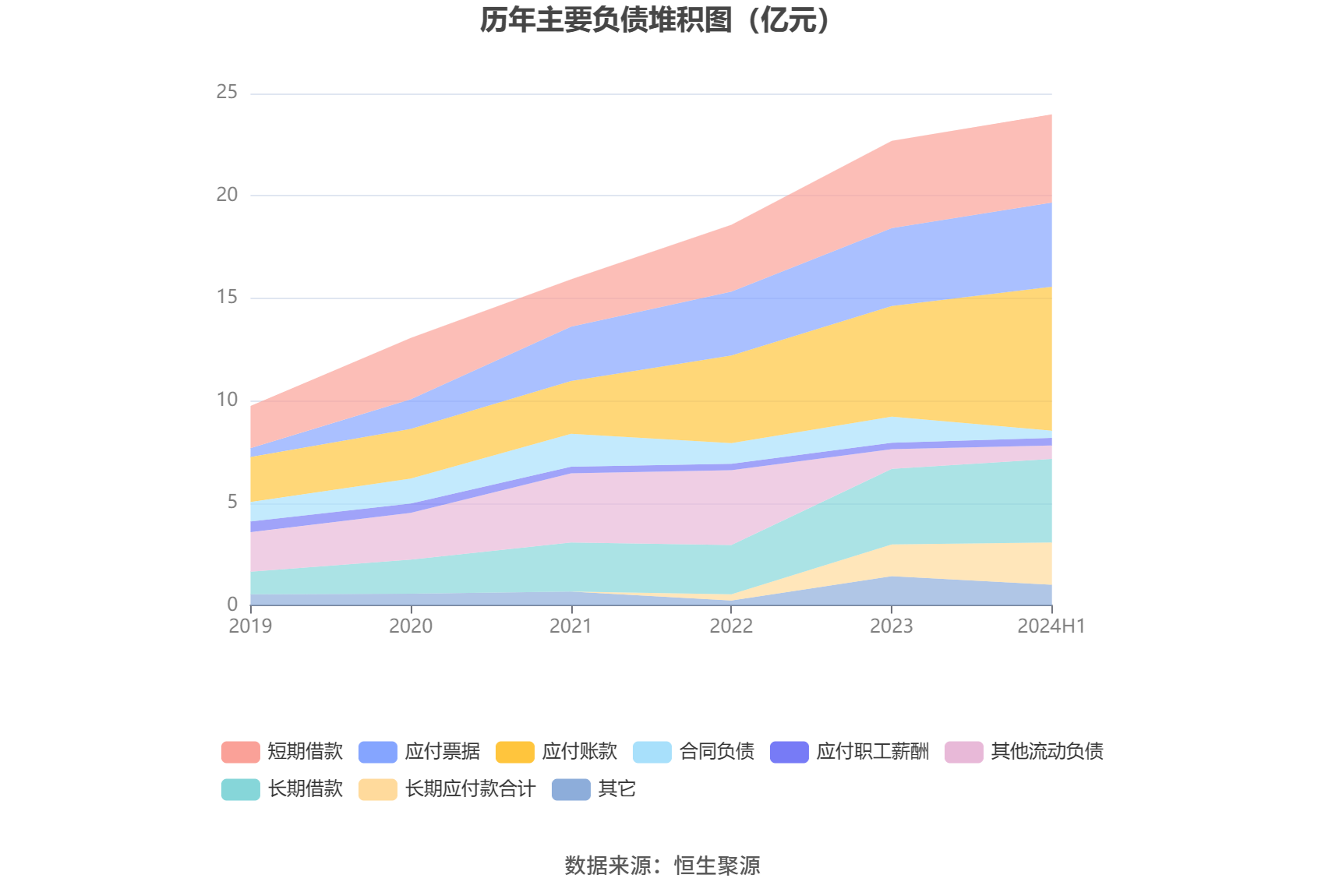 负债重大变化方面,截至2024年上半年末,公司应付账款较上年末增加30.29%,占公司总资产比重上升3.87个百分点,主要系原材料、设备款赊销额度增加;合同负债较上年末减少72.78%,占公司总资产比重下降2.52个百分点,主要系报告期存在履约义务的预收款项逐步履约;长期应付款合计较上年末增加33.91%,占公司总资产比重上升1.26个百分点;长期借款较上年末增加10.61%,占公司总资产比重上升0.76个百分点。
