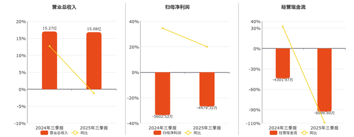 公司营业总收入为15.08亿元。归母净利润为-4479.32万元,较去年同报告期归母净利润增加1123.20万元,实现2年连续上涨。经营活动现金净流入为-8996.60万元。