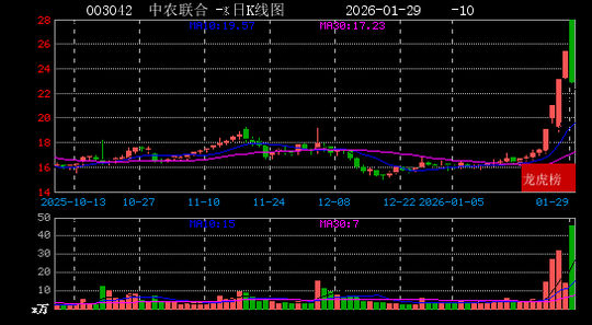 截止收盘,中农联合报收22.87元/股,涨幅-10.0%,成交量45万手,成交额10.80亿元,换手率35.88%。今日未涨停。