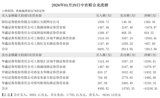 买入前5席为:国信证券股份有限公司浙江互联网分公司、华鑫证券有限责任公司上海源深路证券营业部、华鑫证券有限责任公司深圳益田路证券营业部、华鑫证券有限责任公司上海徐汇区瑞平路证券营业部、华鑫证券有限责任公司上海红宝石路证券营业部。共计买入:6900.72万元,共计卖出:9514.58万元。
