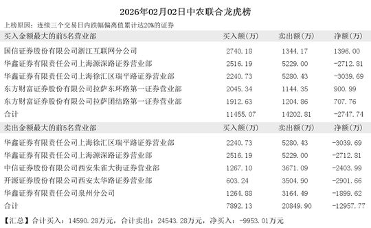 买入前5席为:国信证券股份有限公司浙江互联网分公司、华鑫证券有限责任公司上海源深路证券营业部、华鑫证券有限责任公司上海徐汇区瑞平路证券营业部、东方财富证券股份有限公司拉萨东环路第一证券营业部、东方财富证券股份有限公司拉萨团结路第一证券营业部。共计买入:11455.07万元,共计卖出:14202.81万元。