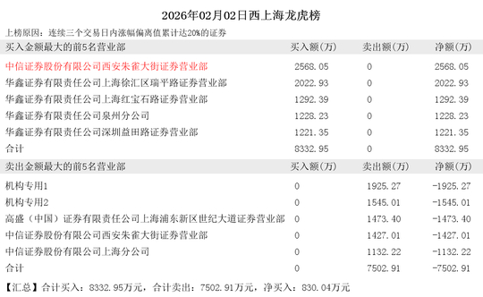 买入前5席为:中信证券股份有限公司西安朱雀大街证券营业部、华鑫证券有限责任公司上海徐汇区瑞平路证券营业部、华鑫证券有限责任公司上海红宝石路证券营业部、华鑫证券有限责任公司泉州分公司、华鑫证券有限责任公司深圳益田路证券营业部。共计买入:8332.95万元,共计卖出:0万元。