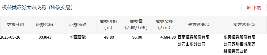 华亚智能今日大宗交易折价成交96万股,成交额4684.8万元