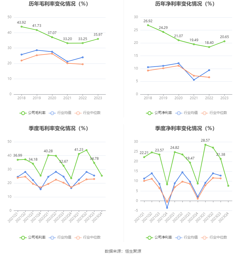 2023年,公司毛利率为35.97%,同比上升2.72个百分点;净利率为20.65%,较上年同期上升2.25个百分点。从单季度指标来看,2023年第四季度公司毛利率为25.38%,同比上升1.83个百分点,环比下降9.40个百分点;净利率为7.66%,较上年同期下降1.14个百分点,较上一季度下降13.72个百分点。