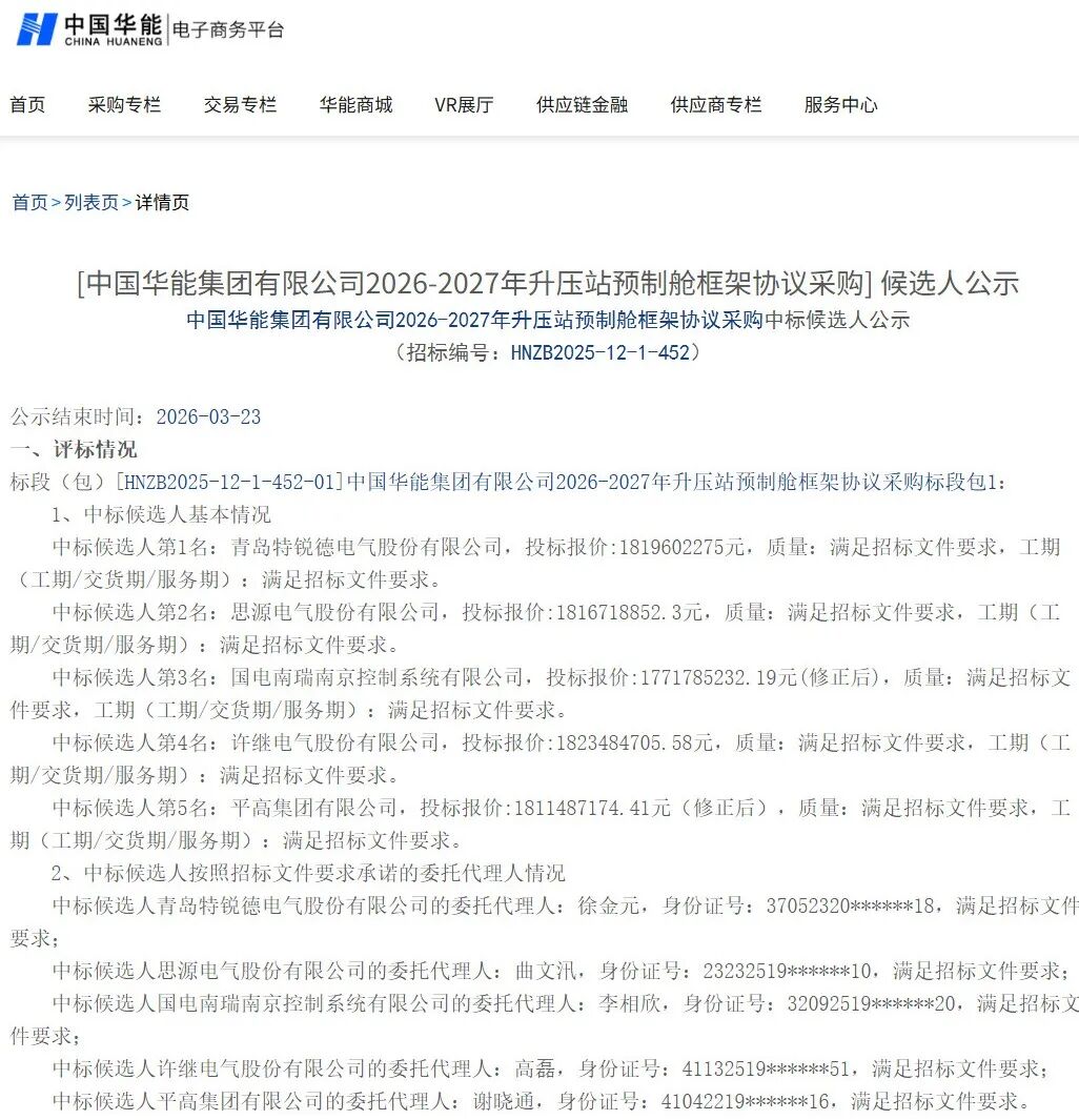 特锐德/思源电气领衔,华能升压站预制舱框采中标候选人公示