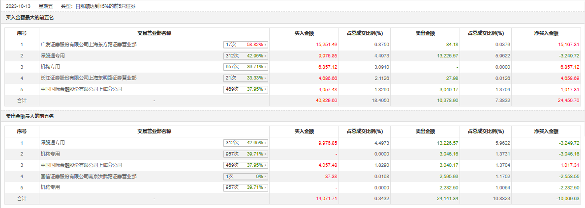 10月13日,乐普医疗今日涨15.91%,全天换手率达7.41%,振幅达20.34%。龙虎榜数据显示,营业部席位合计净买入1.66亿元。其中,机构买入6857.12万元,卖出5278.66万元,合计净买入1578.46万元。此外,广发证券上海东方路证券营业部、深股通专用分别买入1.53亿元、9976.85万元;深股通专用、中国国际金融上海分公司分别卖出1.32亿元、3040.17万元。