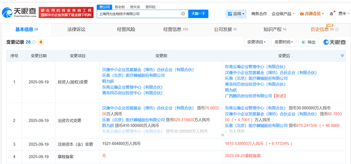 雷达财经讯,天眼查App显示,近日,上海民为生物技术有限公司发生工商变更,新增广西腾讯创业投资有限公司为股东,同时注册资本由约1522万人民币增至约1616万人民币。