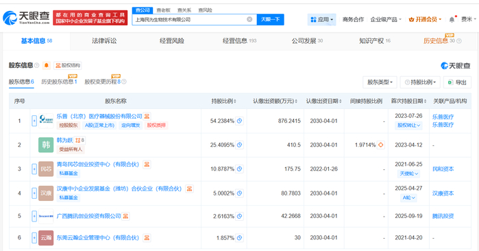 上海民为生物技术有限公司成立于2021年4月,法定代表人为张冰峰,经营范围包括从事生物科技、医疗科技领域内的技术开发、技术咨询、技术转让、技术服务等。股东信息显示,该公司现由乐普医疗(300003)、青岛民芯创业投资中心(有限合伙)及上述新增股东等共同持股。官网显示,该公司专注于前沿“多核心大分子生物药”创新以及平台开发,打造具有全球竞争力的创新药。