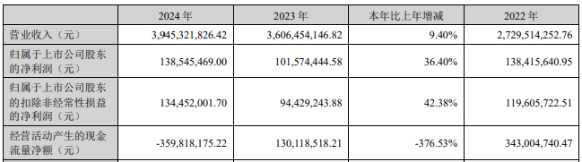 2024年,天海防务营业收入为39.45亿元,归属于上市公司股东的净利润为1.39亿元,归属于上市公司股东的扣除非经常性损益的净利润为1.34亿元,经营活动产生的现金流量净额为-3.60亿元。