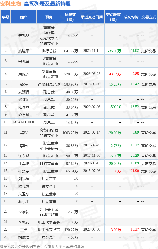 安科生物的高管列表及最新持股情况如下: