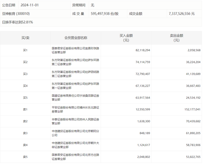 豆神教育今日涨11.21%,龙虎榜数据显示,上榜营业部席位全天成交9.16亿元,占当日总成交金额比例为12.48%。其中,买入金额为3.78亿元,卖出金额为5.38亿元,合计净卖出1.59亿元。