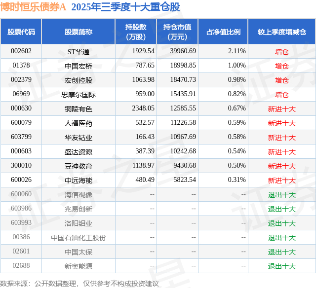 根据2025基金Q3季报公募基金重仓股数据,重仓该股的公募基金共15家,其中持有数量最多的公募基金为博时基金的博时恒乐债券A。博时恒乐债券A目前规模为108.07亿元,最新净值1.2008(11月21日),较上一交易日下跌0.22%,近一年上涨8.16%。该公募基金现任基金经理为张李陵。张李陵在任的基金产品包括:博时信用债纯债债券A,管理时间为2020年7月13日至今,期间收益率为21.65%;博时恒泽混合A,管理时间为2021年2月8日至今,期间收益率为17.63%;博时恒泰债券A,管理时间为2021年4月22日至今,期间收益率为17.68%;博时博盈稳健6个月持有期混合A,管理时间为2021年8月10日至今,期间收益率为-4.58%。