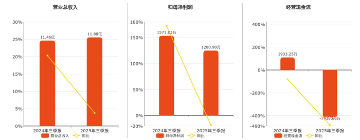公司营业总收入为11.88亿元,在已披露的同业公司中排名第9,较去年同报告期营业总收入增加4276.94万元,实现3年连续上涨,同比较去年同期上涨3.73%。归母净利润为1280.90万元,在已披露的同业公司中排名第19,较去年同报告期归母净利润减少290.93万元,同比较去年同期下降18.51%。经营活动现金净流入为-7438.66万元,在已披露的同业公司中排名第19,较去年同报告期经营活动现金净流入减少9371.91万元,同比较去年同期下降484.77%。