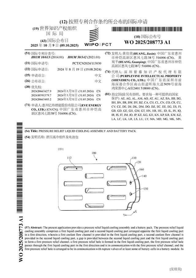 亿纬锂能公布国际专利申请:“泄压液冷组件及电池包”