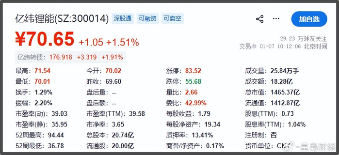 截至1月7日上午10时,亿纬锂能上涨1.51%,报70.65元/股,总市值1465.37亿元。
