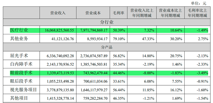 其中,屈光手术、白内障手术和眼前段手术的毛利率下滑幅度在2%—3.5%之间。
