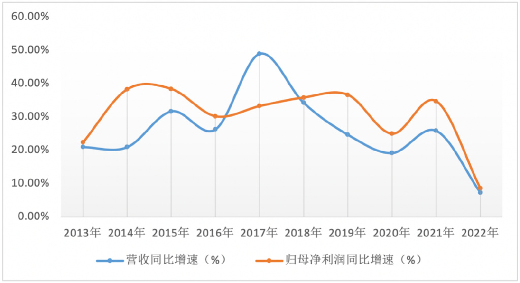 爱尔眼科近十年营收及归母净利润同比增速情况(单位:%)