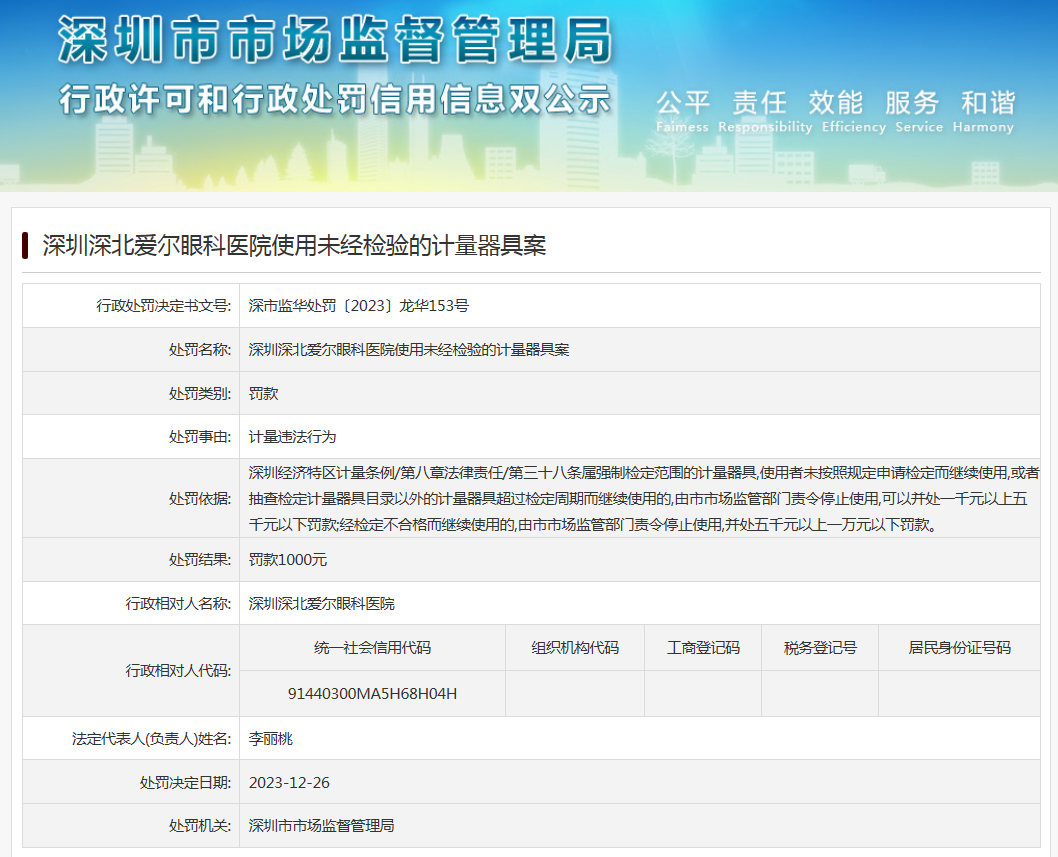 深圳深北爱尔眼科医院使用未经检验的计量器具案