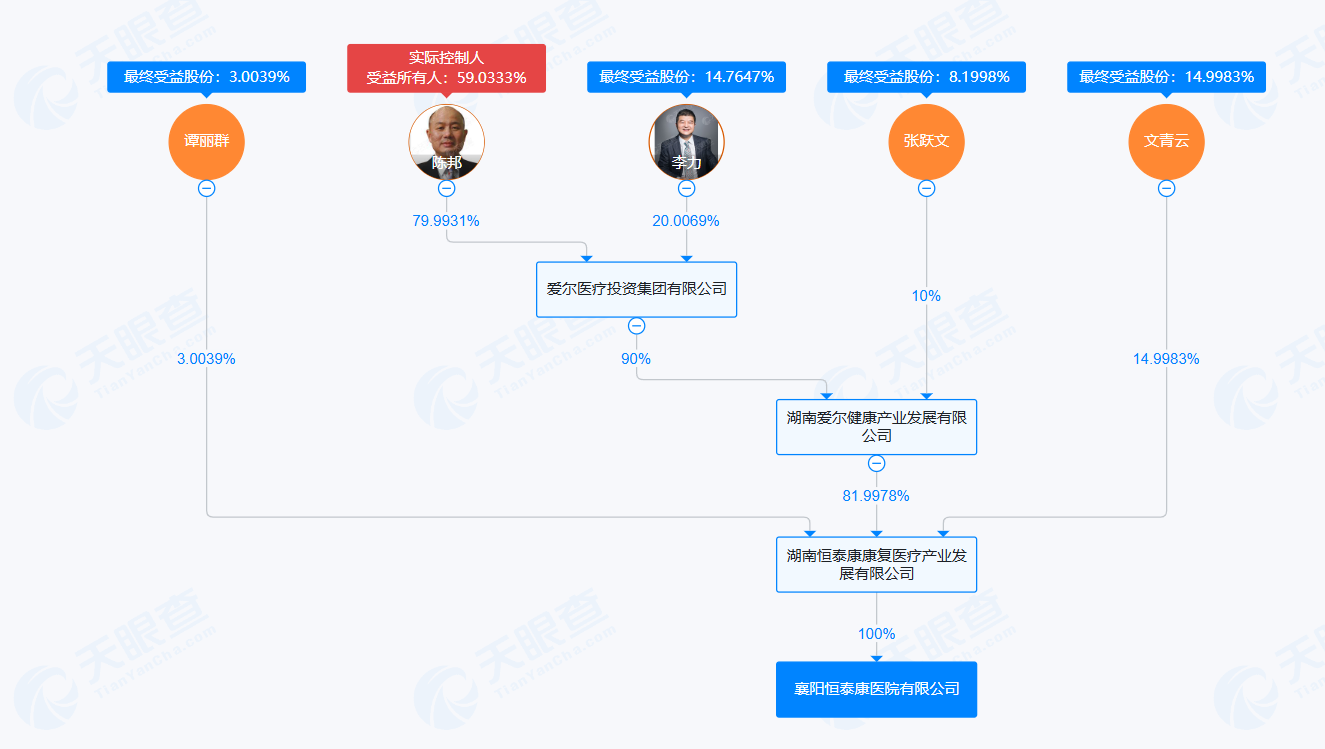 据天眼查股权穿透,襄阳恒泰康医院的最终实控人为爱尔眼科(300015.SZ)实控人、董事长陈邦。
