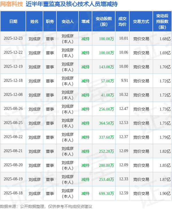 网宿科技近半年内的董监高及核心技术人员增减持详情如下: