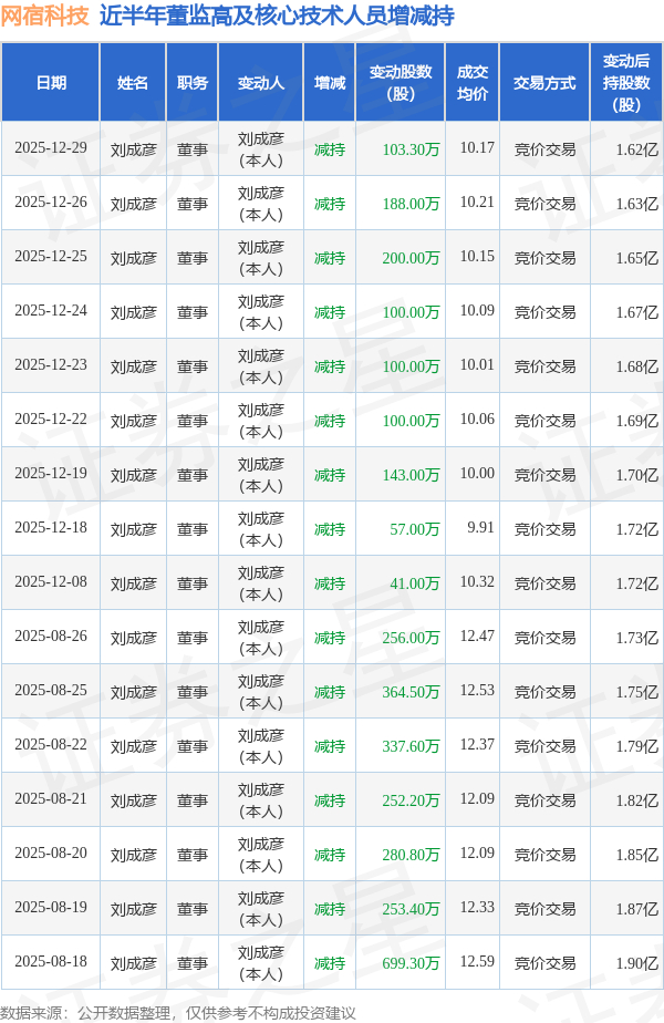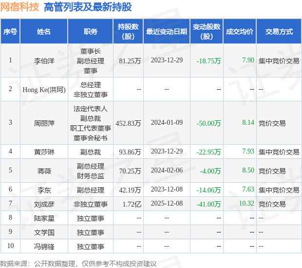 网宿科技近半年内的董监高及核心技术人员增减持详情如下: