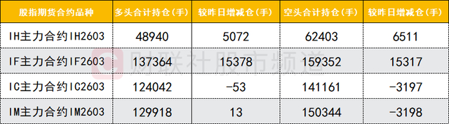 四大期指主力合约中,IH、IF合约多空双方均加仓,其中IH合约空头加仓力度明显大于多头,空头力量占优。IM合约多头加仓,而空头大幅减仓。