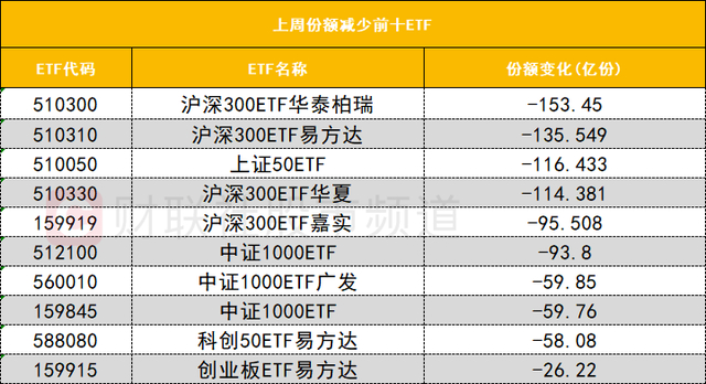 在上周份额减少前十的ETF中,多只沪深300相关ETF份额大幅减少,其中沪深300ETF华泰柏瑞(510300)上周份额减少153.45亿份位居首位。