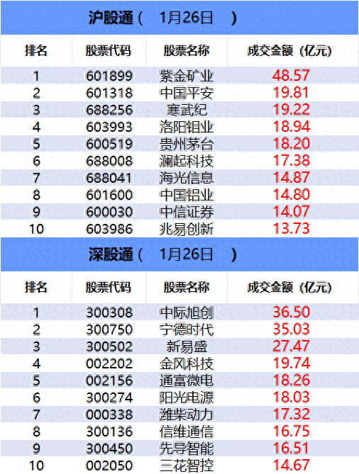 从沪股通前十大成交个股来看,紫金矿业位居首位;中国平安和寒武纪分居二、三位。